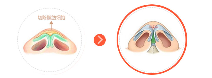 一般沿鼻翼缘作蝶形切口,将鼻翼软骨在穹隆部,作上部分切除,重新缝合塑形,然后再切除皮下多余的结缔组织和脂肪,以及鼻部皮肤。