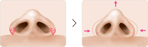适用于鼻翼皮肤较厚或软部组织较多的情况,切除鼻部下方的皮肤,切口位于鼻翼和面颊交接的地方,缝合后聚拢鼻翼。几乎看不出疤痕。